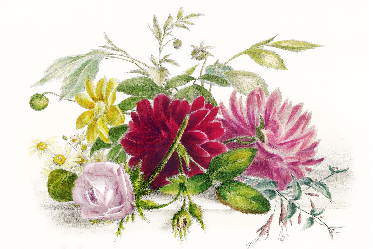 Vintage botanical illustrations. Colorful still life of flowers, 1850