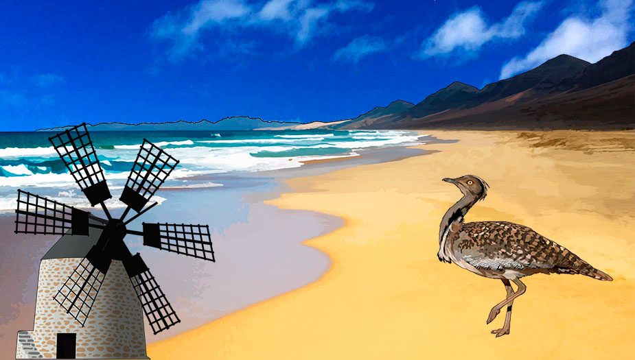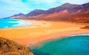 Fuerteventura es una isla de forma alargada, con una superficie de 1.690 km² y 304 kilómetros de costas, lo que la convierte en la segunda isla en extensión del archipiélago. Su máxima altitud es el Pico de La Zarza (807 m), siendo una de las islas más llanas del archipiélago canario. Se encuentra muy cerca de la isla de Lanzarote, de la que está separada, al norte, por el estrecho de La Bocaina, y un pequeño islote, llamado Isla de Lobos.