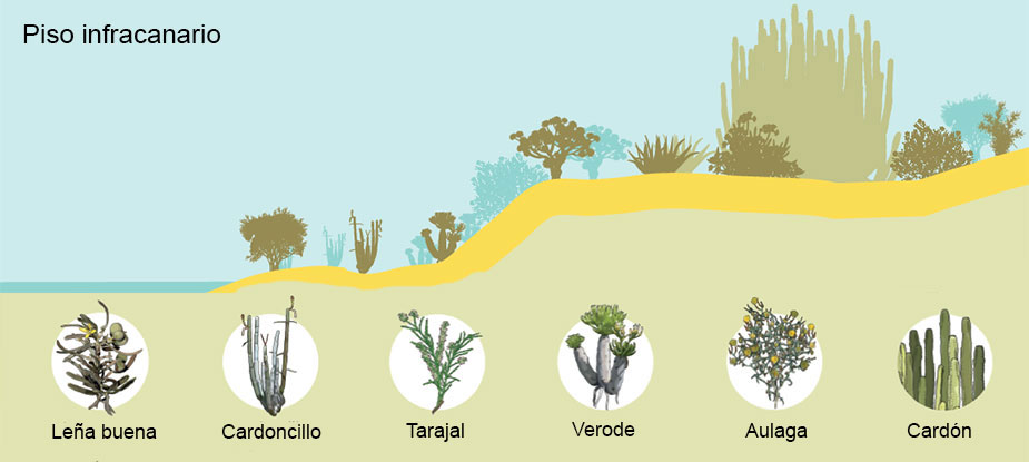 Estos condicionantes climatológicos, así como las características del suelo y la orografía, determinan el tipo de vegetación de esta zona, caracterizada por la ausencia general de especies arbóreas y la presencia mayoritaria de herbáceas y arbustos de mediano tamaño, especialmente preparados para soportar este clima tan riguroso gracias a la generación de diversos mecanismos de adaptación al medio, como son la suculencia, la reducción foliar, la ampliación radicular, la espinosidad de sus tallos y hojas, etc. En las islas orientales, Lanzarote y Fuerteventura, de clima aún más seco que en el resto, la vegetación se halla dominada por especies herbáceas muy resistentes a la falta de agua, especialmente de los géneros Suaeda y Salsola, como Salsola divaricata y Suaeda vera, y arbustos espinosos como la aulaga (Launaea arborescens).