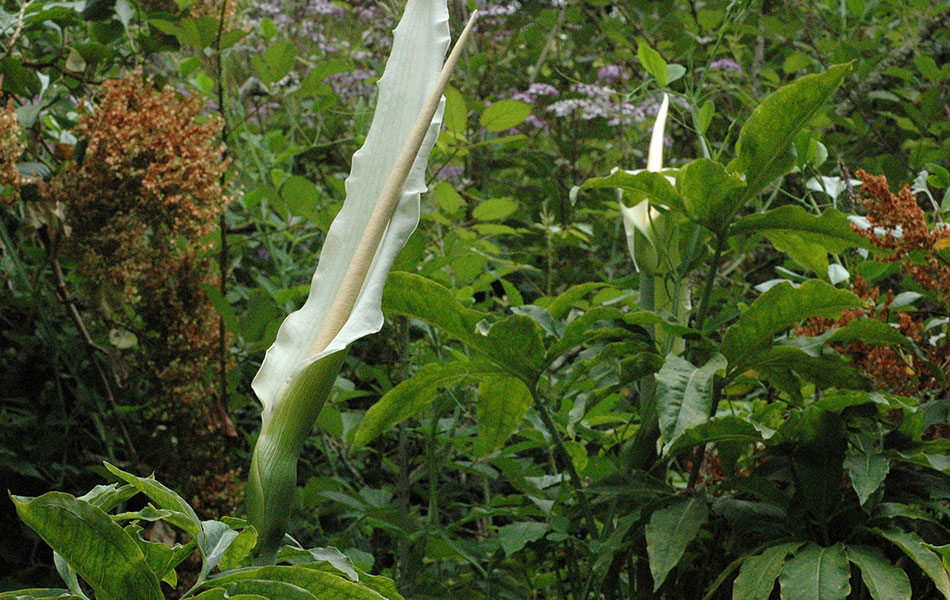 El espádice está rodeado por una bráctea (espata) de color blanco