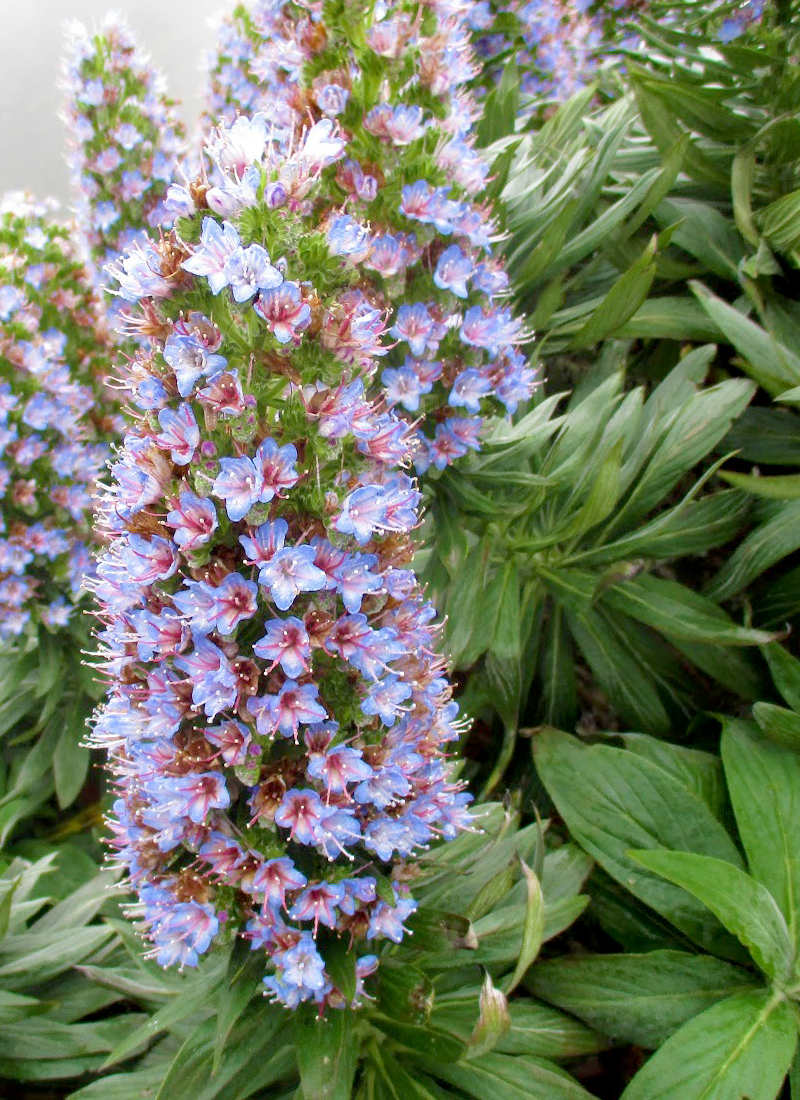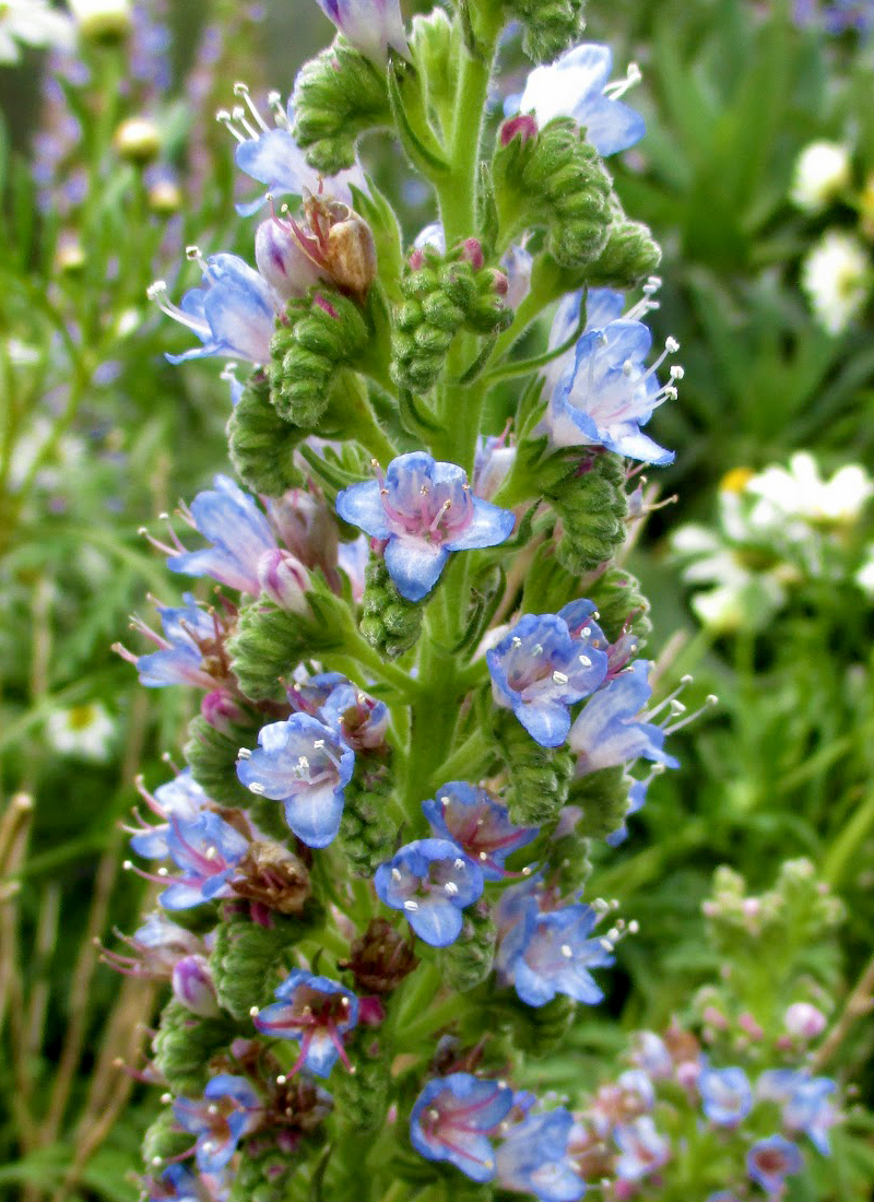 de color azul intenso, se apiñan en largas y estrechas inflorescencias