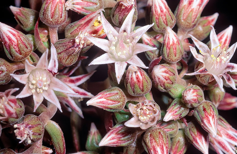 Sus pequeñas flores estrelladas, de color blanquecino o rosáceo, crecen agrupadas en la parte final de inflorescencias hojosas, erectas o algo colgantes, de unos 15-20 cm de largo, que surgen del centro de las rosetas foliares. Cada flor presenta un cáliz acopado de entre 3-5 mm de largo, pubescente, de color verde moteado de rojo, con entre 6-8 sépalos más o menos triangulares y puntiagudos; los pétalos, en igual número que los sépalos, son lanceolados, de unos 7 mm de largo, y presentan una coloración rosácea con el margen blanquecino; los estambres, en doble número que los pétalos y sépalos, miden unos 5-6,5 mm de longitud, con filamentos blancos, aplastados, pubescentes, puntiagudos y con anteras blanquecinas. Al madurar, las flores producen una gran cantidad de pequeñísimas semillas.