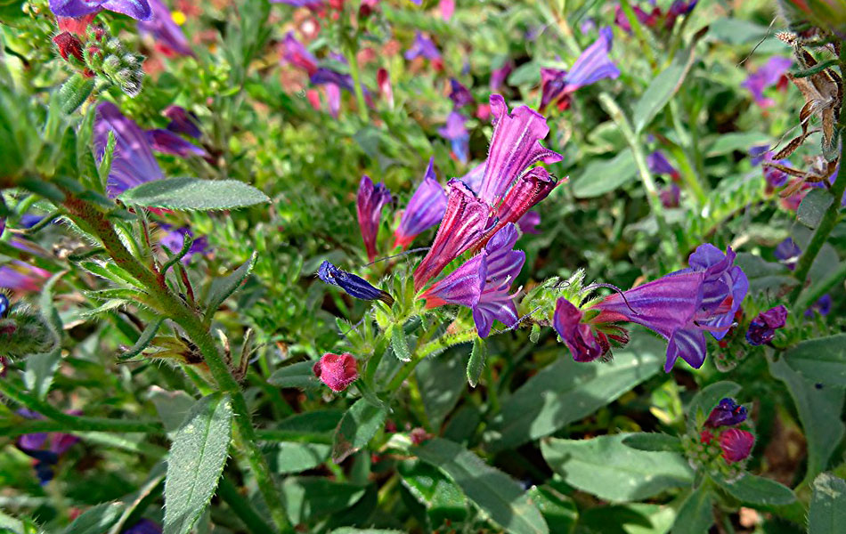 pequeñas y atractivas flores, de color azul con tonalidades rojizas, se
