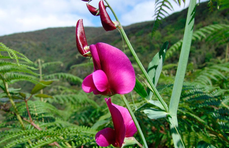 Sus pequeñas pero muy llamativas flores, de hasta unos 2-3 cm de longitud y brillante colorido, que va del rosa pálido al púrpura intenso, que vira hacia el azul o violáceo a medida que se van marchitando, se reúnen en grupitos de una a tres flores cada uno, sostenidos por largos y finos pedúnculos. Cada flor presenta un pequeño cáliz dentado, de color verde rojizo, y una corola mucho mayor, formada por un estandarte, dos alas y una quilla, que es la estructura clásica de las leguminosas.