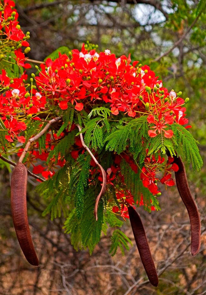 por sus flores rojas o anaranjadas, y su brillante follaje de color