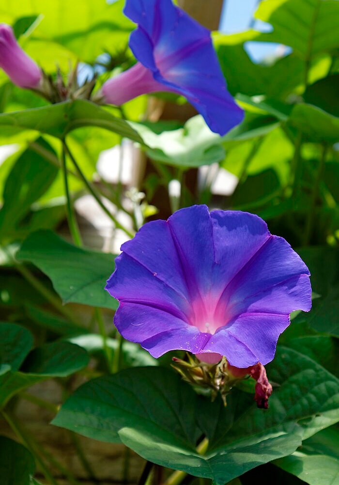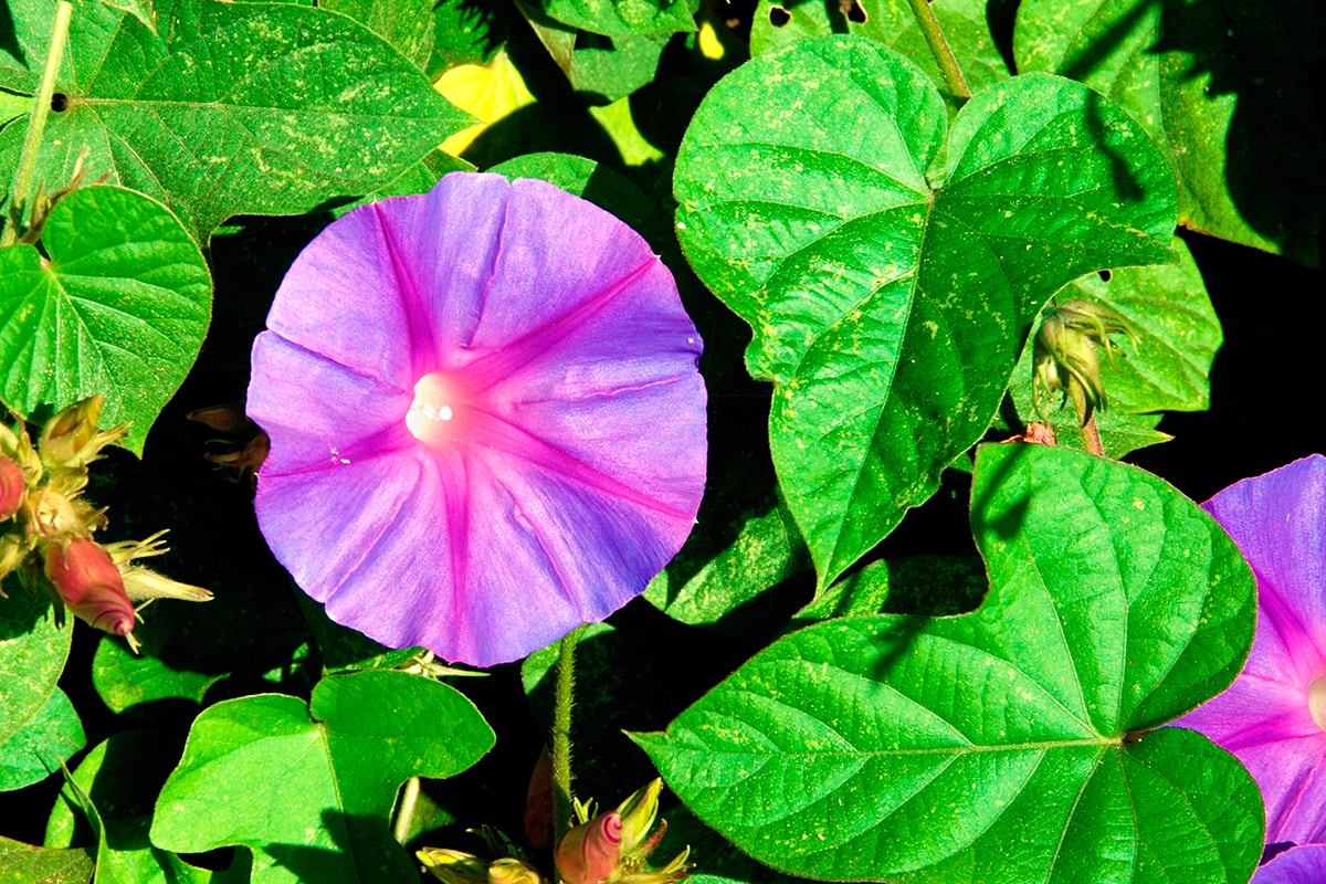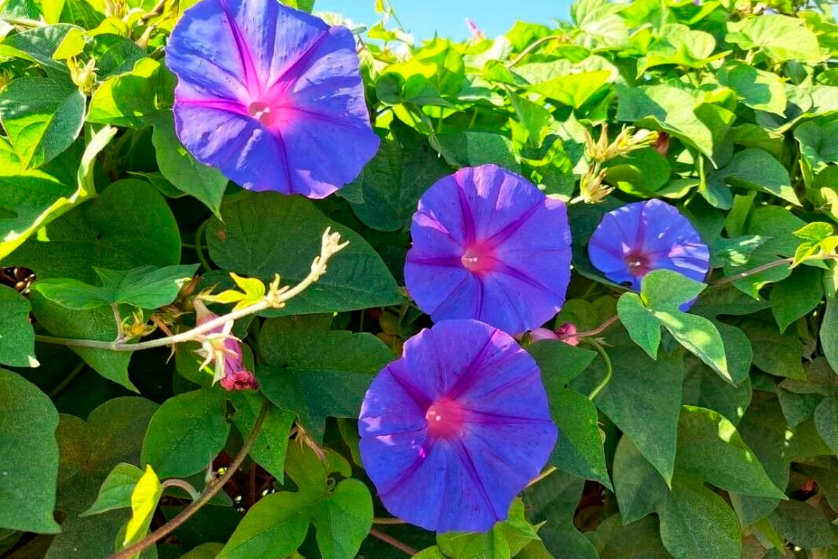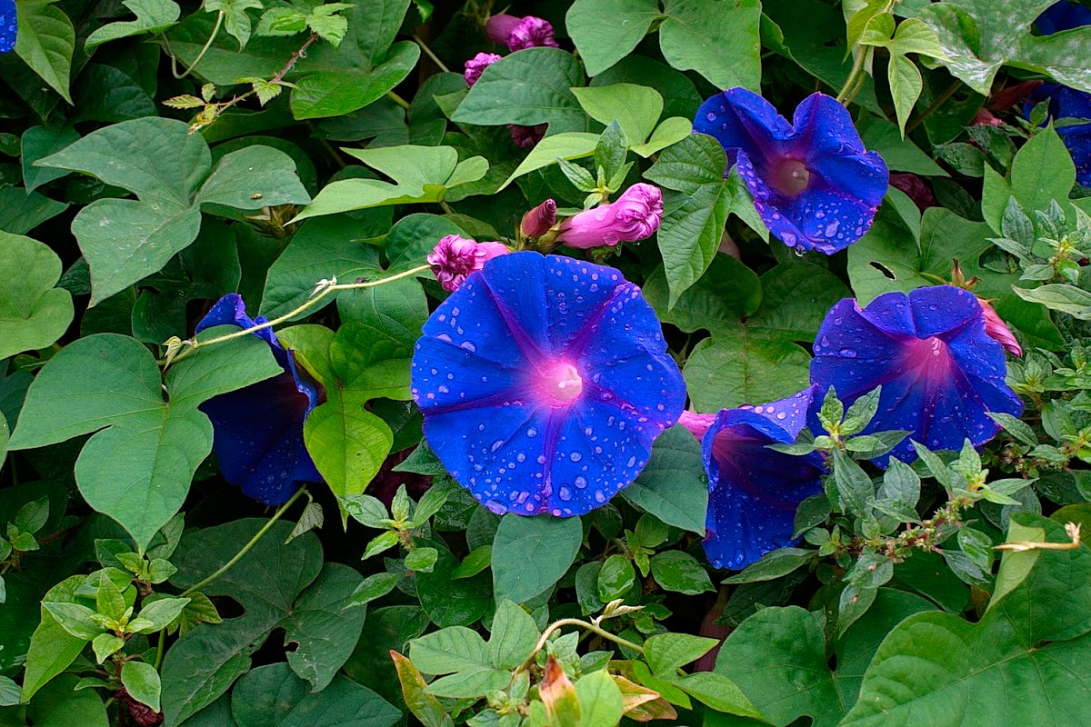 azul purpúreo, morado, rojo o rosa, duran un día y luego se marchitan.
