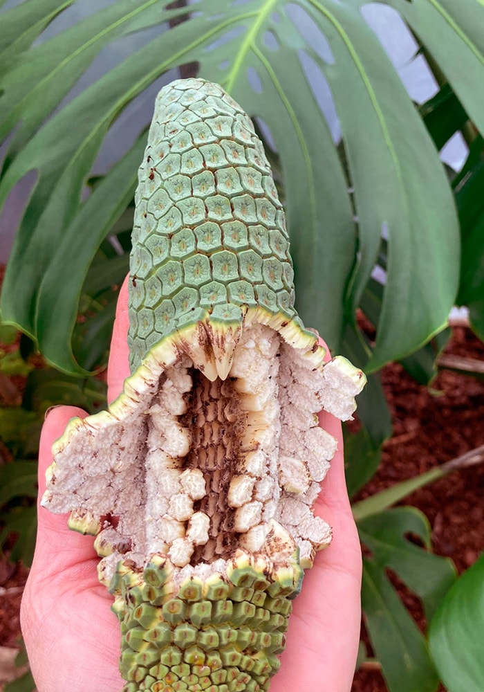 pequeñas bayas hexagonales de color verde exteriormente y blanquecinas